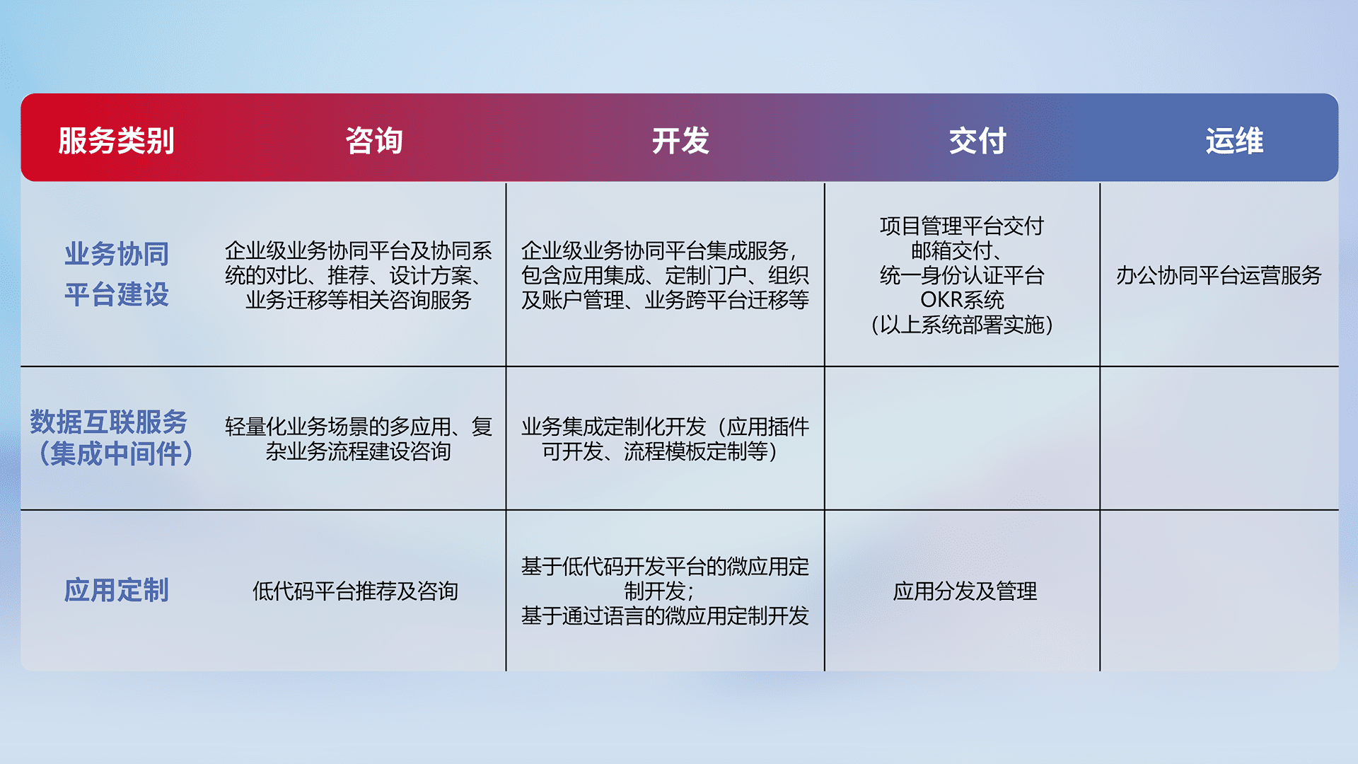 针对钉钉、、、企微、、IDaas等平台级产品提供产品的规划、、、、方案、、、交付、、、定制化开发等服务,,实现如统一协同办公、、、、智能客户服务、、、混合会议管理、、智能数据查询、、、、等业务场景,,,,实现数字化转型。。