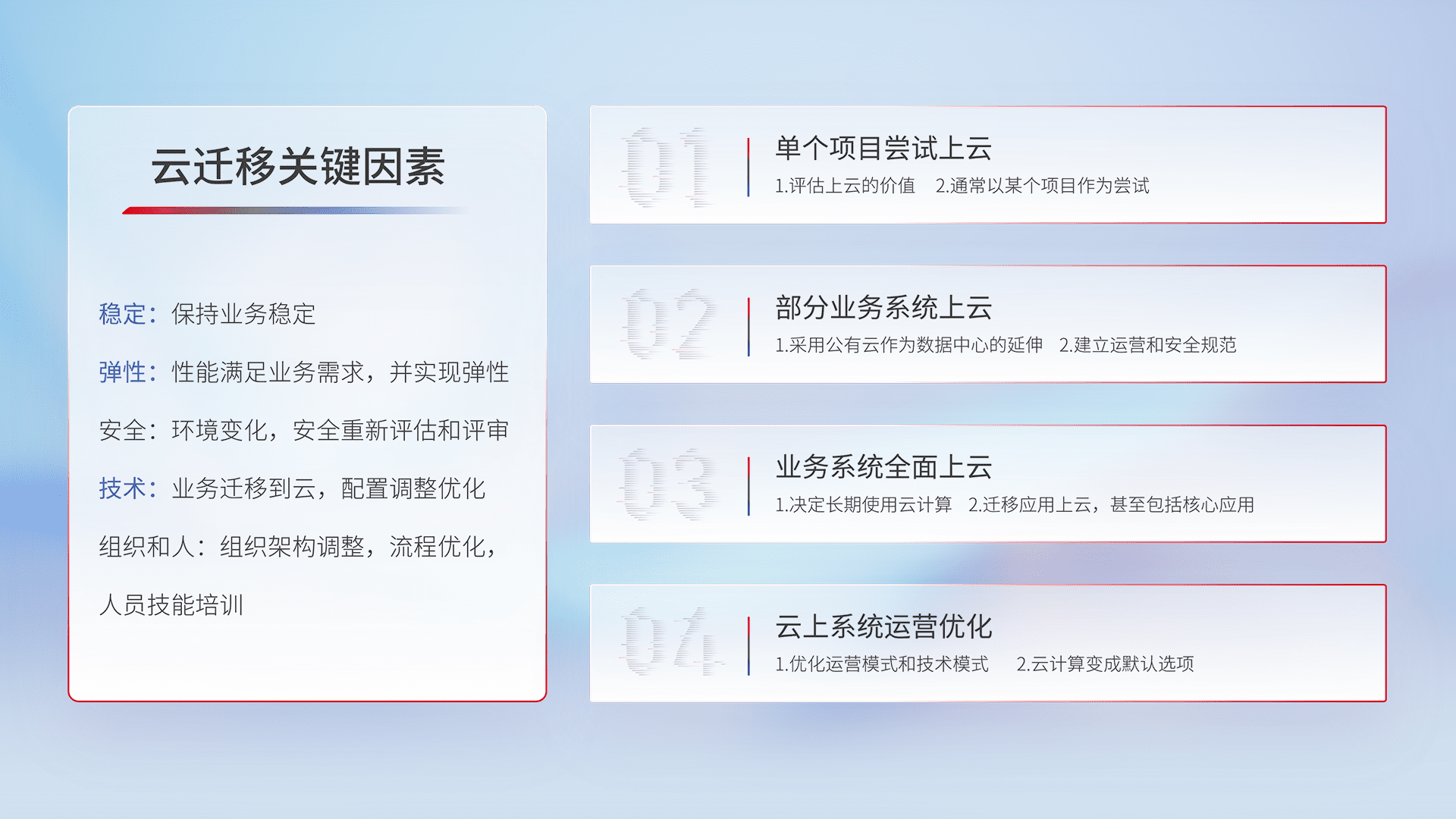 结合实际业务,,,从规划设计、、、云平台选型、、、云原生改造、、、、数据迁移、、、、集成交付,,,,迁移全过程为客户识别最佳上云路径,,,做好风险识别管理,,,,设计网络架构、、、身份权限、、安全审计合规、、、操作审计、、日志审计、、监控告警策略、、、多站点容灾设计等,,,,对云上基础设施进行整体规划,,,提升IT治理水平,,以满足弹性、、、、高可用、、、、高性能的需求。。