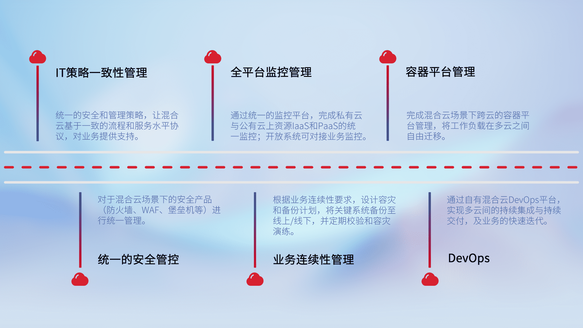 通过多云纳管,,,以统一的资源数据模型把客户的云资源进行抽象和封装,,,,进而实现对多云资源的统一操作,,,保障云资源管理的可靠性、、、、稳定性与可用性。。量身定制化运维内容,,配置、、、开发运维、、、补丁管理、、备份、、、监控、、认证和访问管理、、、审计和日常巡检等,,,,保障在用云过程中的可靠度,,稳定度以及高可用率。。