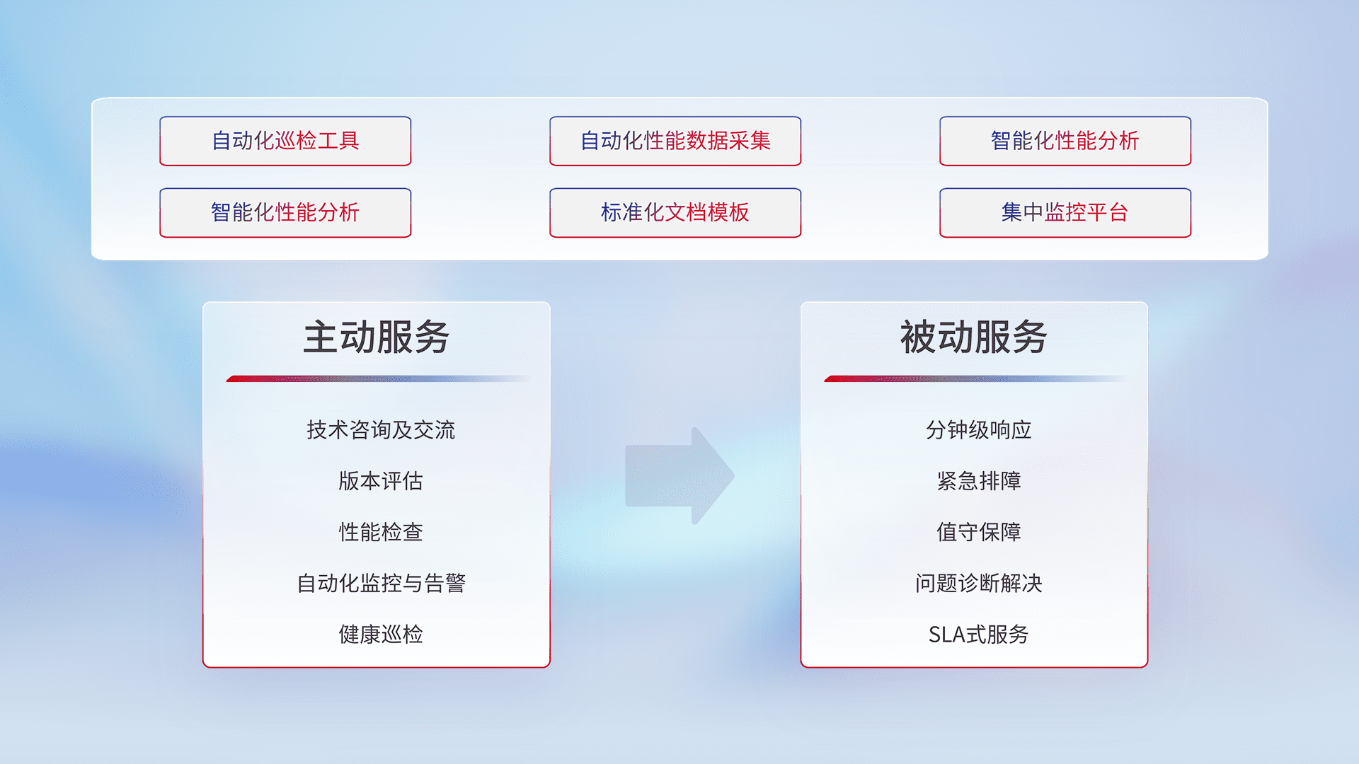 智能化工具和标准化文档,,保障服务质量,,,,提供主动服务(包含技术咨询、、、、版本评估、、性能检查、、、自动化监控与告警、、健康巡检)和被动服务包含(分钟级响应、、、、紧急排障、、、、值守保障、、、问题诊断解决、、SLA服务)。。